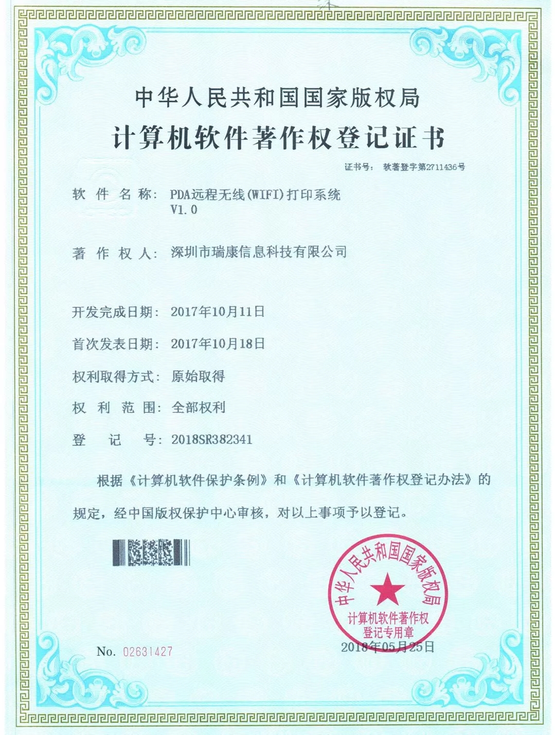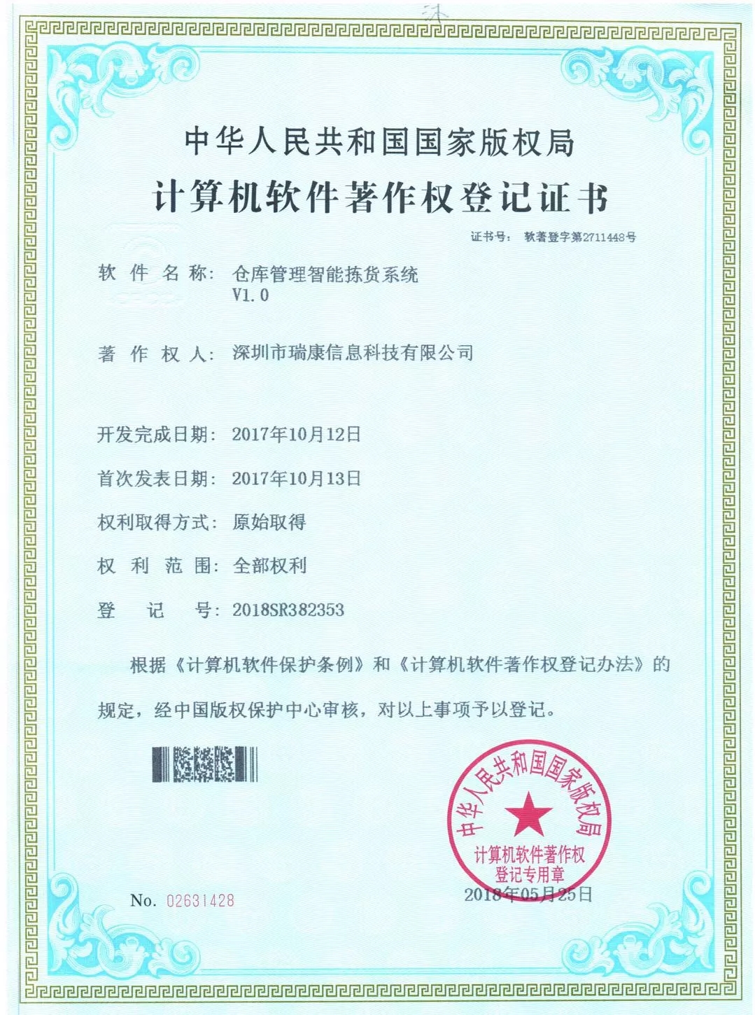 本次由我司獨立研發(fā)的《倉庫管理智能揀貨系統(tǒng)V1.0》、《PDA遠(yuǎn)程無線(WIFI)打印系統(tǒng)V1.0》經(jīng)中華人民共和國國家版權(quán)局考證,被認(rèn)定為這兩個軟件的法定著作權(quán)人,從頒證之日起,其版權(quán)將得到“中國版權(quán)保護(hù)中心”的有效保護(hù)。