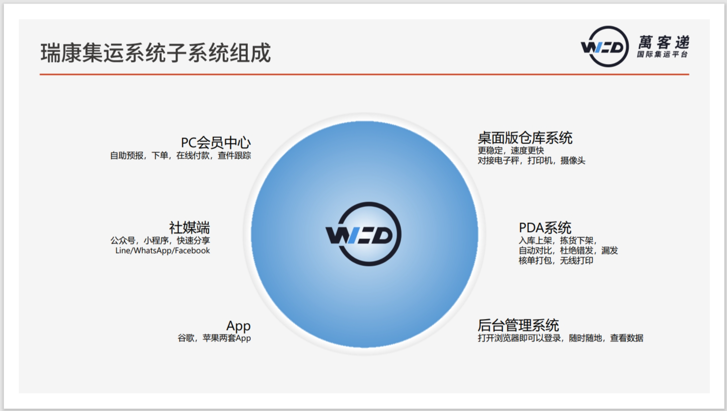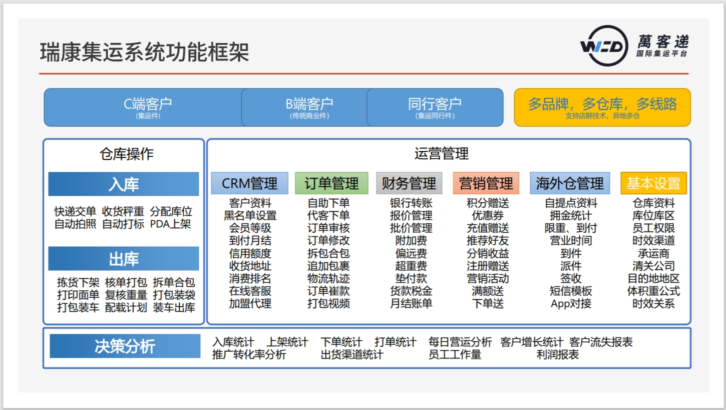 瑞康集運(yùn)系統(tǒng)是專門(mén)為跨境集運(yùn)服務(wù)商設(shè)計(jì)研發(fā)的集訂單管理、會(huì)員管理、財(cái)務(wù)管理、倉(cāng)儲(chǔ)管理為一體的信息化系統(tǒng)。